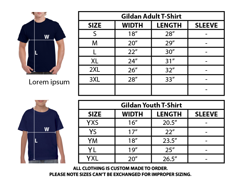 - Please refer to the size chart as we make to order and cannot replace shirts that are ordered in the wrong size.